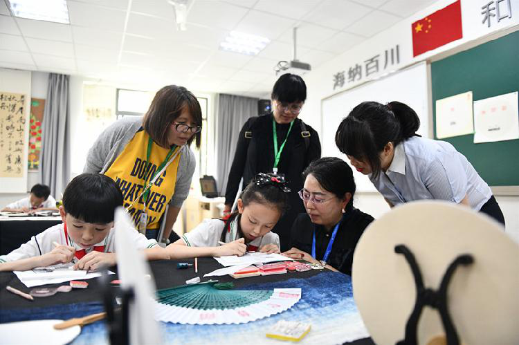 5月16日中午,渝中区人和街小学教育集团展示了20余节主题文化课程,让与会者切实感受到了学校课程在“人和文化”引领下所散发出来的独特魅力。在鲁班锁展示课,小讲解员为嘉宾讲解鲁班锁的原理,并示范如何操作。在文字博物馆,同学们带领来宾在甲骨文上做拓印。在篆刻教室,同学们用橡皮章雕刻印章,邀请嘉宾共同制作或为其盖章……各式各样丰富生动的文化课程,获得了来宾们的一致点赞。