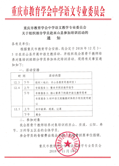 welcome赢乐中学语文教学专业委员会关于组织部分学员赴巫山县参加培训活动的通知